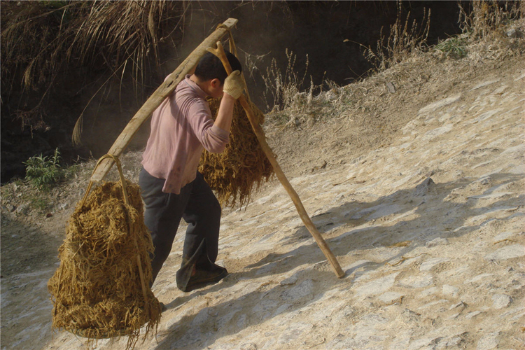 人工挑青草上曬攤
