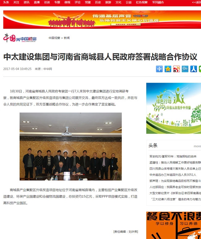 中國網(wǎng)報道了“中太建設(shè)集團與河南省商城縣人民政府簽署戰(zhàn)略合作協(xié)議”