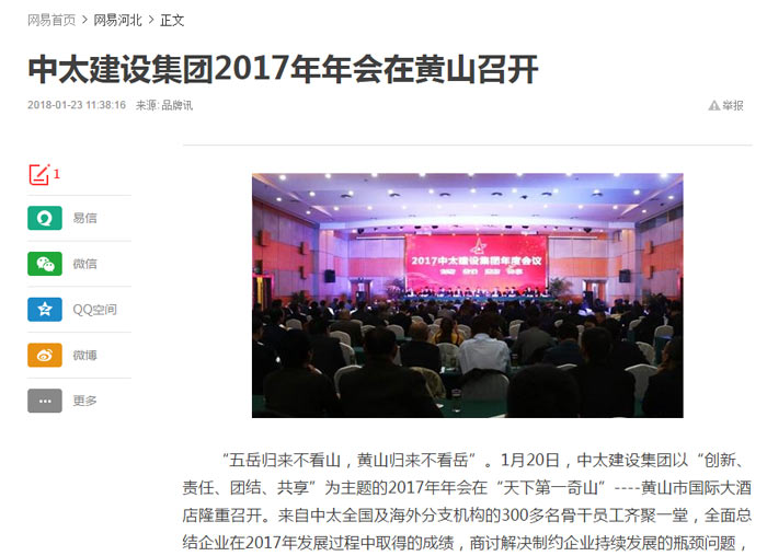 網(wǎng)易報(bào)道了“中太建設(shè)集團(tuán)2017年年會在黃山召開”