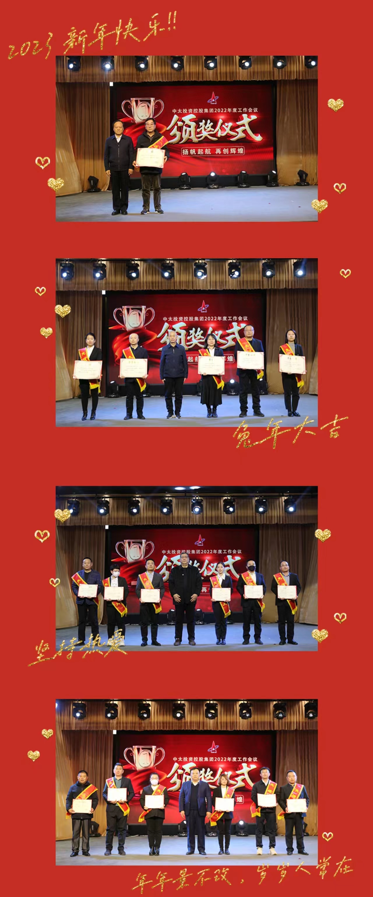 會(huì)上,中太投資控股集團(tuán)董事局主席助理郭政杰宣讀了《關(guān)于表彰2022年度先進(jìn)集體和先進(jìn)個(gè)人的決定》,并對(duì)獲獎(jiǎng)?wù)哌M(jìn)行了表彰頒獎(jiǎng)。燕振義總裁在午宴上致祝酒辭,與會(huì)代表集體合影留念并共同觀看了“迎新春文藝晚會(huì)”節(jié)目。年會(huì)在歡樂祥和的氣氛中落下帷幕。