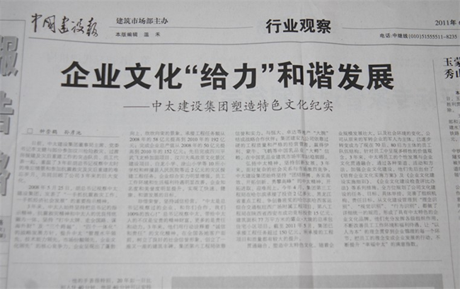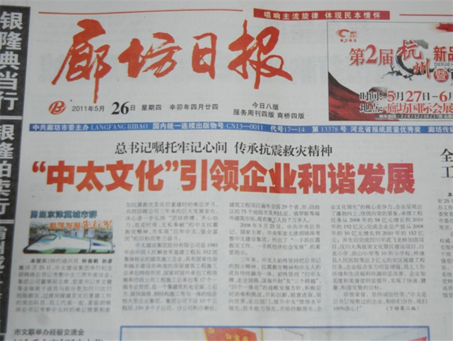 近日,中國(guó)建設(shè)報(bào)、文匯網(wǎng)、河北經(jīng)濟(jì)日?qǐng)?bào)、長(zhǎng)城網(wǎng)、廊坊日?qǐng)?bào)等多家媒體對(duì)公司三年來(lái)銘記胡錦濤總書記視察中太囑托、弘揚(yáng)抗震救精神,創(chuàng)新發(fā)展,銳意進(jìn)取所取得的豐碩成果進(jìn)行集中報(bào)道,擴(kuò)大了企業(yè)知名度,提升了中太品牌的社會(huì)影響力。