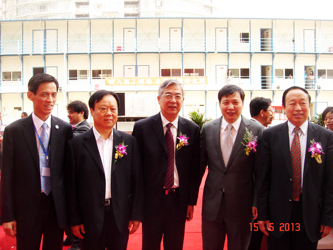 2013年5月15日上午,伴隨著最后一方混凝土的成功澆注,在50余名駐華外交使節以及外交部、北京市等有關部門代表的見證下,由集團公司第八工程局承建的亮馬橋外交辦公大樓工程正式實現主體結構封頂。董事局主席李文健(左一)應邀出席儀式。
