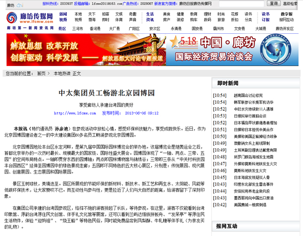 廊坊傳媒網(wǎng)報(bào)道了中太集團(tuán)員工暢游北京園博園