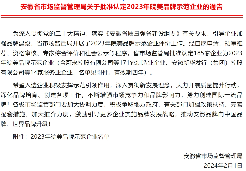 為深入貫徹落實《安徽省質量強省建設綱要》,大力推進品牌建設,經企業自愿申請、各市(縣)市場監管局推薦、資格審核和專家綜合評價等流程層層篩選,中國宣紙股份有限公司成功入選2023年皖美品牌示范企業! “皖美品牌”示范企業是深入貫徹落實《安徽省質量強省建設綱要》等文件精神,發揮品牌在建設質量強省、發展新興產業中的引領作用,培育認定的品質卓越、服務優良、信譽過硬的自主品牌優秀企業。 本次入選“皖美品牌示范企業”,是對中國宣紙股份有限公司品牌影響力極大的肯定。未來,我司將充分發揮皖美品牌企業示范作用,持續擴大品牌影響力,為美好安徽建設貢獻更多力量。 序號 企業名稱 1 蔚來控股有限公司 2 合肥新滬屏蔽泵有限公司 3 四創電子股份有限公司 4 安徽萬瑞冷電科技有限公司 5 合肥中南光電有限公司 6 安徽新華發行(集團)控股有限公司 7 合肥工大高科信息科技股份有限公司 8 安徽樂庫智能停車設備有限公司 9 中水三立數據技術股份有限公司 10 安徽宏源鐵塔有限公司 11 安徽合凱電氣科技股份有限公司 12 合肥惠科金揚科技有限公司 13 安徽輝隆集團銀山藥業有限責任公司 14 安徽環瑞電熱器材有限公司 15 安徽科創中光科技股份有限公司 16 安徽肥肥網絡傳媒有限責任公司 17 安徽廬峰交通科技有限公司 18 合肥豐華汽車零部件有限公司 19 合肥市菲力克斯電子科技有限公司 20 合肥開關廠有限公司 21 合肥欣奕華智能機器股份有限公司 22 安徽皖信人力資源管理有限公司 23 安徽德科電氣科技有限公司 24 合肥晟泰克汽車電子股份有限公司 25 華誼城市服務科技有限公司 26 安徽大千生物工程有限公司 27 合肥琥珀家具有限責任公司 28 安徽中科中渙智能裝備股份有限公司 29 安徽永昌新材料有限公司 30 合肥海特微波科技有限公司 31 安徽遠成物業管理有限公司 32 安徽嘉偉新材料科技有限責任公司 33 安徽諾益科技有限公司 34 安徽中源環??萍加邢薰?/span> 35 安徽卓越電力設備有限公司 36 合肥迅達包裝股份有限公司 37 安徽科凌沃特水處理技術有限公司 38 長鑫存儲技術有限公司 39 安徽金巖高嶺土新材料股份有限公司 40 安徽康迪納電力科技有限責任公司 41 方園(安徽)智能裝備有限責任公司 42 安徽中冶淮海裝配式建筑有限公司 43 安徽省虹源飼料科技有限公司 44 安徽慶豐涂料科技有限公司 45 安徽馮了性中藥材飲片有限公司 46 信和光能(安徽)有限公司 47 利辛縣富亞紗網有限公司 48 安徽智揚門業股份有限公司 49 安徽亞珠金剛石股份有限公司 50 安徽億人安股份有限公司 51 安徽省伊貝雅紡織股份有限公司 52 安徽儒特實業有限公司 53 安徽高堅機械科技有限公司 54 實慕家居有限公司 55 安徽新秀化學股份有限公司 56 安徽飛凱電子技術有限公司 57 安徽海尚變頻技術有限公司 58 安徽豐原福泰來聚乳酸有限公司 59 安徽克菱保健科技有限公司 60 蚌埠天成包裝科技股份有限公司 61 安徽興宇軌道裝備有限公司 62 安徽省華凱輕工科技有限公司 63 安徽開來包裝有限公司 64 安徽精菱玻璃機械有限公司 65 安徽云龍糧機有限公司 66 安徽佳安智慧養老服務有限公司 67 安徽瑞琦塑膠科技有限公司 68 阜南佳利工藝品股份有限公司 69 阜陽欣奕華材料科技有限公司 70 安徽京九絲綢股份公司 71 安徽聚力糧機科技股份有限公司 72 界首市金龍機械設備有限公司 73 安徽興安電氣設備股份有限公司 74 安徽省天翔醫療股份有限公司 75 美亞高新材料股份有限公司 76 安徽維東建材股份有限公司 77 安徽唐興裝備科技股份有限公司 78 安徽三興檢測有限公司 79 平安開誠智能安全裝備有限責任公司 80 安徽中宇玻璃制品有限公司 81 安徽九綱機電有限公司 82 安徽開潤股份有限公司 83 通用生物(安徽)股份有限公司 84 安徽揚子安防股份有限公司 85 安徽光智科技有限公司 86 晶鋒集團股份有限公司 87 滁州惠科光電科技有限公司 88 安徽眾博新材料有限公司 89 安徽秀朗新材料科技有限公司 90 安徽金鵬節能科技股份有限公司 91 安徽博石高科新材料股份有限公司 92 安徽省浦菲爾建材有限公司 93 安徽亞蘭密封件股份有限公司 94 安徽江淮揚天汽車股份有限公司 95 安徽省益農化工有限公司 96 安徽省瀚海新材料股份有限公司 97 安徽省六安恒源機械有限公司 98 安徽星鑫材料科技股份有限公司 99 霍山匯能汽車零部件制造有限公司 100 安徽首礦大昌金屬材料有限公司 101 安徽管仲木業有限公司 102 安徽太陽體育用品有限公司 103 安徽海瑞通科技股份有限公司 104 三聯泵業股份有限公司 105 馬鞍山宏力橡膠制品有限公司 106 安徽桑瑞斯環保新材料有限公司 107 安徽天順環保設備股份有限公司 108 安徽宏翔農業機械有限公司 109 馬鞍山市廣源法蘭環件有限公司 110 安徽錦華氧化鋅有限公司 111 盾安(蕪湖)中元自控有限公司 112 中鼎恒盛氣體設備(蕪湖)股份有限公司 113 蕪湖佳先傳動軸有限公司 114 蕪湖金牛電氣股份有限公司 115 安徽宇測線纜質檢技術有限公司 116 來邦科技股份公司 117 安徽華通電纜集團有限公司 118 蓓慈電器有限公司 119 東隆家紡股份有限公司 120 蕪湖安瑞光電有限公司 121 蕪湖市夯福機械模具有限公司 122 蕪湖東旭光電科技有限公司 123 安徽國電電纜股份有限公司 124 安徽天兵電子科技股份有限公司 125 蕪湖通和汽車流體系統有限公司 126 