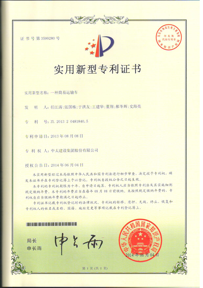 集團公司再獲一項實用新型專利《一種簡易運輸車》。至此,集團公司已累計獲得國家專利十五項,其中發明專利五項,實用新型十項。(企業技術中心 董翔)