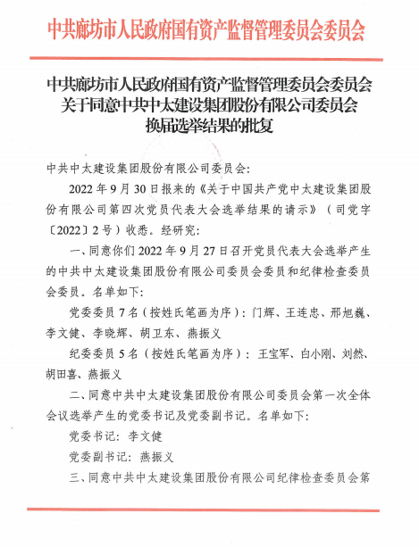 [2022] 3號關(guān)于轉(zhuǎn)發(fā)《中共廊坊市國有資產(chǎn)監(jiān)督管理委員會委員會關(guān)于同意中共中太建設(shè)集團(tuán)股份有限公司